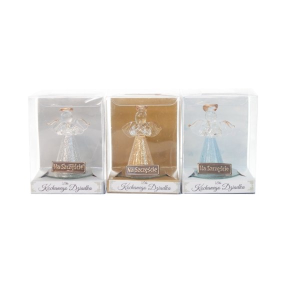 Anioł szklany dla kochanego dziadka z napisem "Na szczęście" w ozdobnym opakowaniu - mix wzorów