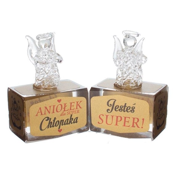 Szklany aniołek na postumencie. Rozmiar 4x6 cm. Napisy po dwóch stronach postumentu.