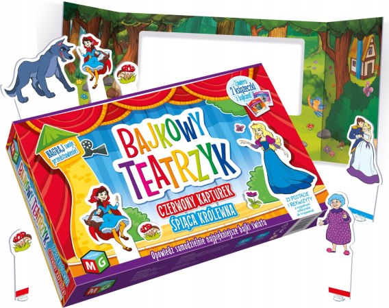 Rekwizyty rozstawione, aktorzy naszykowani, a do Twoich uszu dochodzą szepty widowni, czekającej, aż rozpocznie się przedstawienie! Scena teatru ma w sobie magię, która od setek lat przyciąga ludzi niczym magnes! Spróbuj skosztować odrobiny tych czarów i wystaw dla rodziny i przyjaciół piękne ponadczasowe bajki - "Czerwonego Kaptura" i "Śpiącą Królewnę". Przeczytaj książeczki z tymi historiami, a następnie użyj swojej wyobraźni, aby za pomocą załączonych postaci ożywić opowieści na scenie!