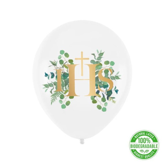 Biały balon komunijny z charakterystyczną dla serii Eukaliptus grafiką. Złoty napis IHS otoczony jest zielonymi gałązkami eukaliptusa. Razem z innymi produktami tej serii, stanowić będzie wspaniały zestaw dekoracji przyjęcia komunijnego, zarówno sali jak i stołu.