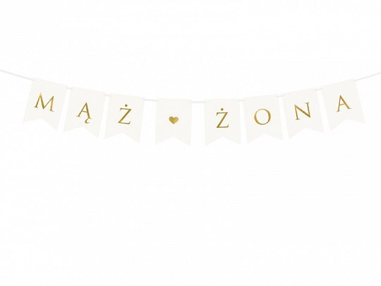 Baner w kolorze białym ze złotym napisem Mąż Żona, do samodzielnego złożenia, zestaw zawiera literki i ok. 2,5m białej tasiemki.