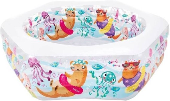 Dmuchany, kolorowy basen dla najmłodszych w kształcie sześciokątu o wymiarach 191 x 178 x 61 cm.Produkt posiada bardzo przyjemną dla maluszka grafikę z małą wydrą i foczką. Basen sprawdzi podczas upalnych dni na ogrodzie lub tarasie. Do zestawu dołączony został gotowy zestaw naprawczy. Wszystkie dzieci będą zachwycone zabawą w wodzie w upalne dni.
