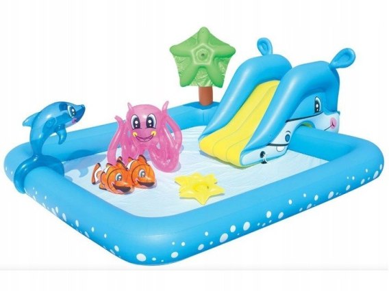 Atrakcją basenu jest wyjmowana dmuchana zjeżdżalnia, a także mnogością dmuchanych, morskich zwierzątek. Na rogu basenu znajduje się palma, z której po podłączeniu węża ogrodowego leje się woda. Bogactwo kształtów i kolorów zachęci każdego do zabawy w tak fantastycznym basenie