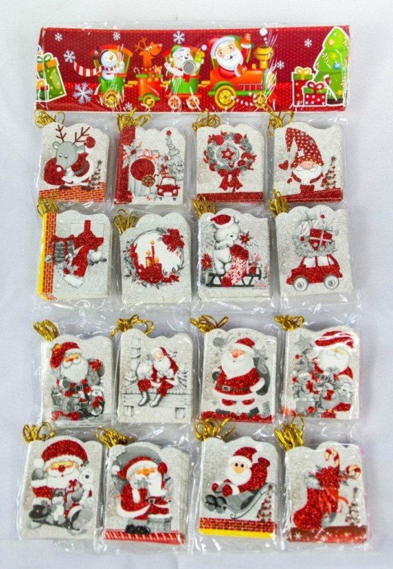 Opakowanie z bilecikami prezentowanymi umieszczonymi w kieszonkach, którą można łatwo zawiesić. Wszystkie bileciki z motywem bożonarodzeniowym, w większości przedstawiające Św. Mikołaja. Idealne jako dodatek do prezentu pod choinkę. Zawierają pozłacany sznurek do łatwego mocowania.