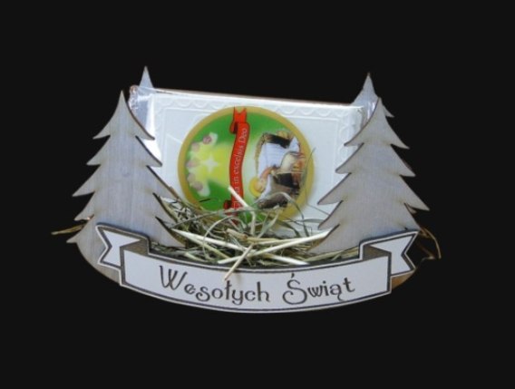 Świąteczny bujaczek - koszyczek w srebrnym kolorze z napisem Wesołych Świąt ze siankiem i opłatkiem