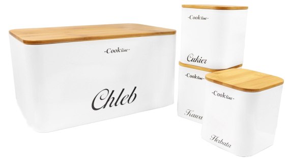 Chlebak emaliowany z pokrywką bambusową RAFANO 42,5x23x16,5cm BIAŁY + 3 POJEMNIKI