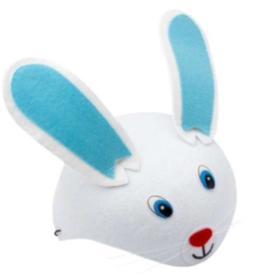 Czapka filcowa Królik w biało błękitnym kolorze. Zdobiona charakterystycznymi elementami na wzór Królika. Dodatkowo czapka posiada różowy nosek oraz niebieskie oczy. Czapeczka przymocowana jest gumeczką, którą zakłada się pod brodę. Czapeczka w rozmiarze uniwersalnym.
