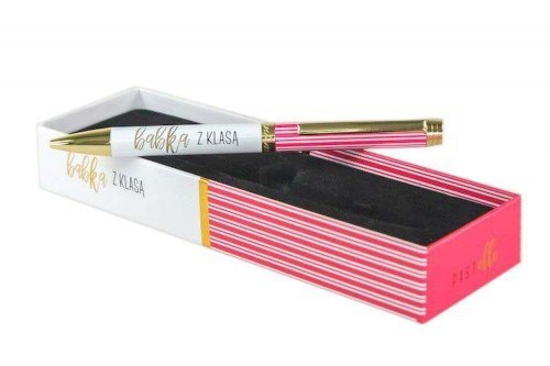 Długopisy Pastelle spełniają wszystkie warunki idealnego prezentu - są piękne, praktyczne, świetnie wykonane i zapakowane w atrakcyjne pudełeczko. Co więcej, mają nawet atrakcyjną cenę! Różowy długopis z napisem "Babka z klasą" świetnie leży w dłoni, ma delikatny wzór w paski w górnej części, a złote akcenty dodają ekskluzywnego uroku - to idealny prezent.