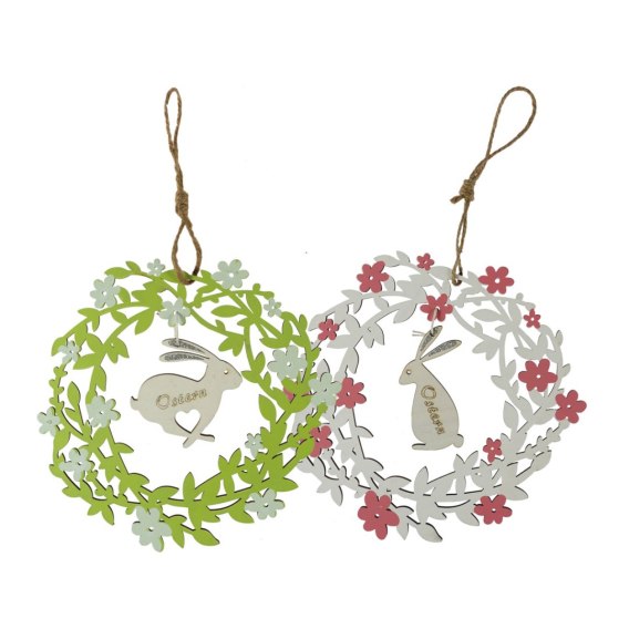 Drewniana dekoracja wielkanocna z zajączkiem - dostępna w dwóch wersjach kolorystycznych: zielonej i różowej. Produkt certyfikowany FSC.