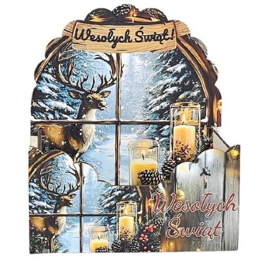 - Design: kolorowy nadruk z gotowymi życzeniami świątecznymi