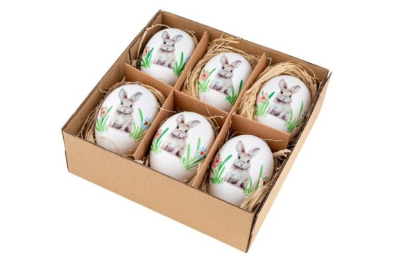 Jajka plastikowe gęsie 8cm kolor biały z dekoracjami 6szt. WPJ-0178