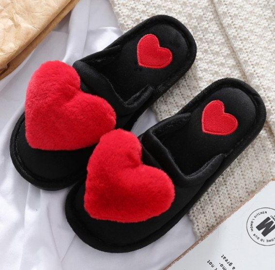 Kapcie damskie futrzane, pluszowe z serduszkiem CZARNO-CZERWONE 40 - 41 KE-108-B