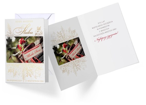 Kartka wielkości B6, zdobiona w zależności od wzoru metaliczną folią lub brokatem, kartka z tekstem w środku, kolorowa w środku i na zewnątrz.