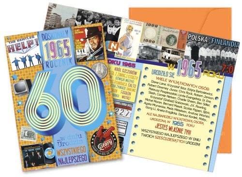 Karnet Vision "Urodziny 60" V-121 Kartka z serii To Był Rok, w której w środku i na froncie znajdują się ciekawe wydarzenia z danego roku. Wykonane z niezwykłą dbałością o szczegóły, zdobione folią holograficzną i w całości pokryte folią matową dla podkreślenia efektu prostoty i elegancji. Każdy karnet zawiera w środku starannie dobrane życzenia oraz dopasowaną kopertę. W powiększonym formacie 140x190 mm. Cechy szczegółowe: wnętrze: kolorowe, wyjątkowe życzenia w środku, w komplecie: dopasowana kolorystycznie koperta. wymiary kartki 14 x 19 cm okazja: urodziny