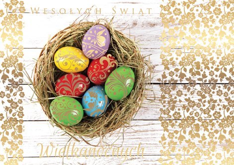 Kartka wielkości B6, zdobiona w zależności od wzoru metaliczną folią lub brokatem, kartka z tekstem w środku, kolorowa w środku i na zewnątrz.