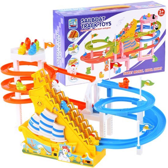 Zabawa polega na przemieszczaniu się Kurek ruchomymi schodkami do śliskiej zjeżdżalni, aby mogły wrócić ponownie na ruchome schody. Podczas całej zabawy schody migają kolorowymi światełkami w rytm wesołej melodyjki, którą można wyłączyć. Żywa kolorystyka i ciekawy kształt toru zapewnią wiele godzin niesamowitej zabawy. Kolor toru może się różnić od koloru na opakowaniu. Tor może działać zarówno przy użyciu baterii 3 x 1,5 V AA, jak również za pomocą kabla USB.