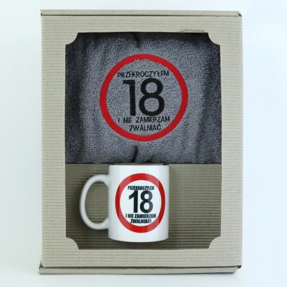 Komplet ręcznik+kubek w pudełku ''PRZEKROCZYŁEM 18..''