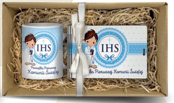 • Komplet w pudełku kubek 330ml + banknotówka 10 x 15,5cm NIEBIESKI KOMUNIA ŚW