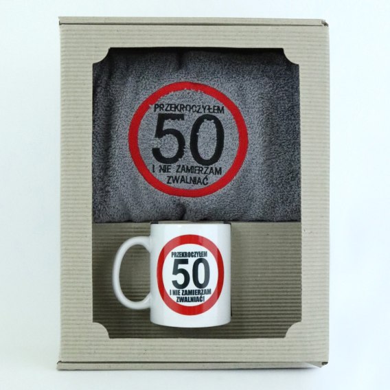 • Kpl.ręcznik+kubek w pudełku ''PRZEKROCZYŁEM 50..''