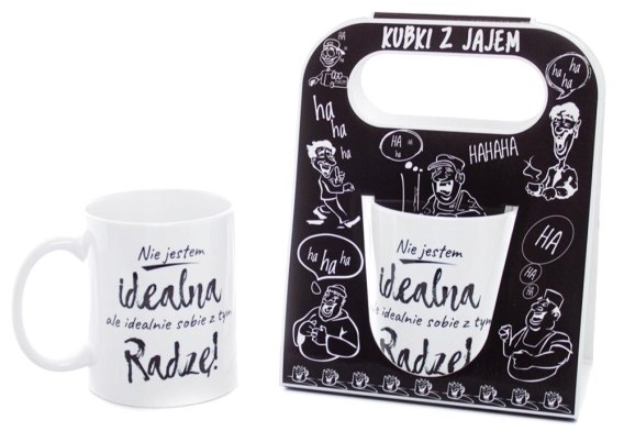 Kubek ceramiczny 'Nie jestem Idealna...' biały w ozdobnym czarnym opakowaniu