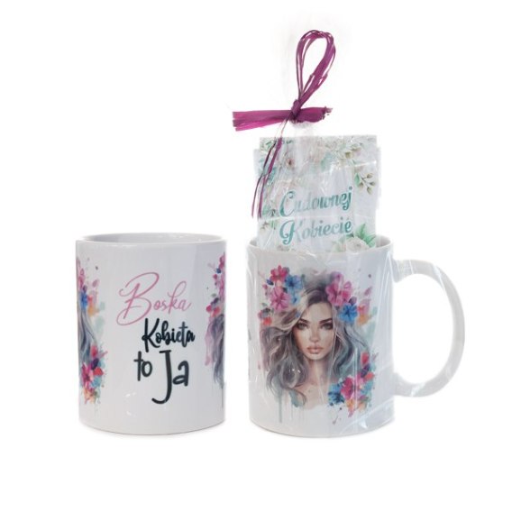 Kubek ceramiczny z napisem "Boska Kobieta to Ja" z herbatką owocową.