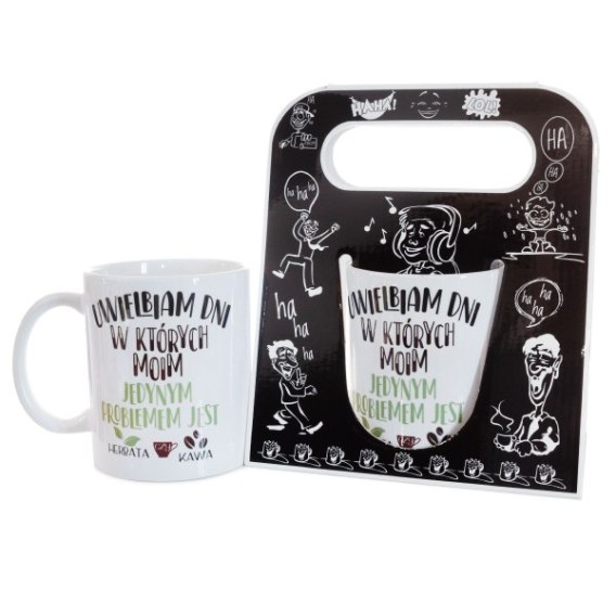 • Kubek ceramiczny z napisem "Uwielbiam dni w których moim jedynym problemem jest herbata czy kawa", w ozdobnym czarnym opakowaniu