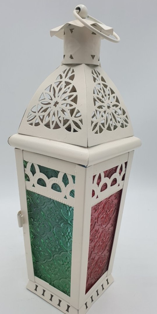 Latarnia metalowa z kolorowymi szybkami biała / czarna 32 cm LAT-16035