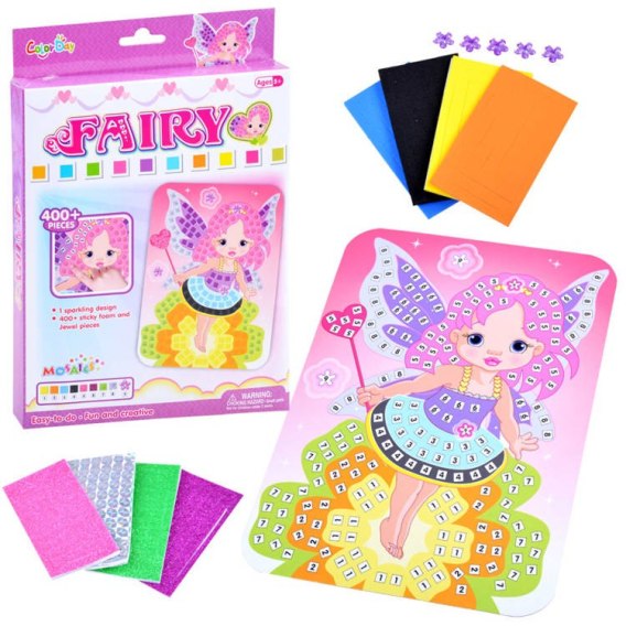 Mozaika wróżka to kreatywny zestaw dla dzieci lubiących prace plastyczne. Zestaw składający się kolorowego obrazka, na który należy wykleić piankowymi kwadracikami, oczywiście dostosowując kolory i kształty.