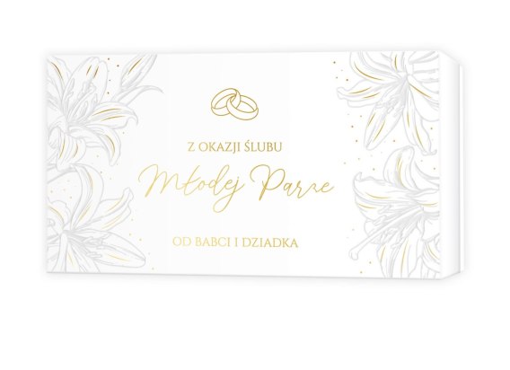 Pudełko z okazji Ślubu idealnie sprawdzi się do wręczenia małego upominku lub banknotów. Wykonane z grubej tektury i foliowanego papieru, tak by zachować trwałość. Ozdobione złoceniem i tłoczeniem, przy użyciu eleganckiego wzornictwa. W środku zawiera kartkę z życzeniami i miejscem na wpis.