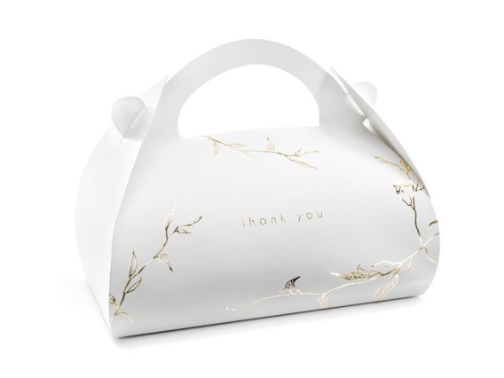 Ozdobne pudełka na ciasto, wykonane z białego papier ze złotym metalizowanym wzorem gałązek. Wymiary po złożeniu ok. 16 x 8,5 x 9,5 cm.