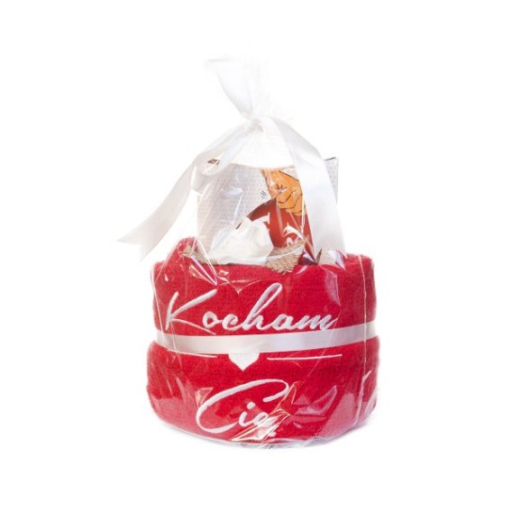 Ręcznik czerwony z haftem "Kocham Cię" + słodycze