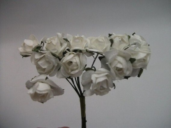 Różyczki na druciku. Idealne do scrapbookingu oraz wykorzystywane w florystyce jako dodatek do świątecznych, ślubnych, komunijnych kompozycji. Opakowanie zawiera 12 bukiecików po 12 szt. różyczek każdy. Cena za opakowanie 144 szt.
