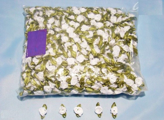 Białe różyczki satynowe/atłasowe z zielonym listkiem o średnicy 13mm zapakowane w woreczek foliowy po 1000 szt. Różyczki stanowią wyjątkową dekorację kartek okolicznościowych, albumów, prezentów lub szytych ubranek na chrzest lub roczek.