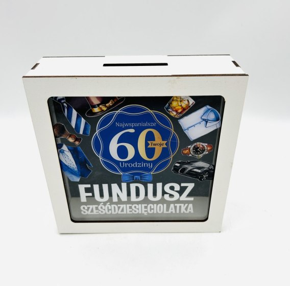 Skarbonka z okienkiem dla mężczyzny z okazji 60 urodzin. Kolorowy nadruk z życzeniami dla mężczyzny. Skarbonka z okienkiem z przeźroczystej plexi, które pozwala śledzić efekty oszczędzania. Pakowane w folię.
