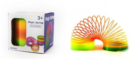 Sprężyna we wszystkich kolorach tęczy została wykonana z elastycznego tworzywa. Może być rozciągnięta na naprawdę bardzo dużą długość. Sprężyna umożliwia wiele rodzajów zabawy, ale najbardziej znana jest z możliwości na przykład spuszczania jej ze schodów. Odpowiednie ustawienie sprężyny sprawia, że sama będzie ona schodzić kolejno po każdym stopniu.