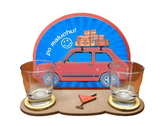 Stojak "Maluch" z kolorowym nadrukiem, zawiera 2 szklane kieliszki. Taki upominek może być ciekawym, śmiesznym i niepowtarzalnym prezentem.