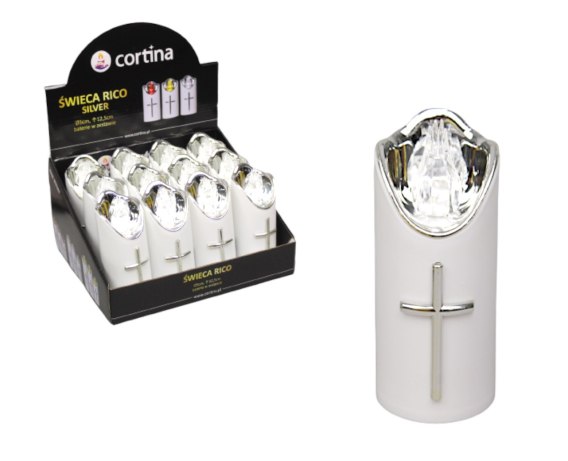 Świeca LED RICO 15 x 5cm biało-srebrna z transparentnym płomieniem 2/23/LUX.DIS