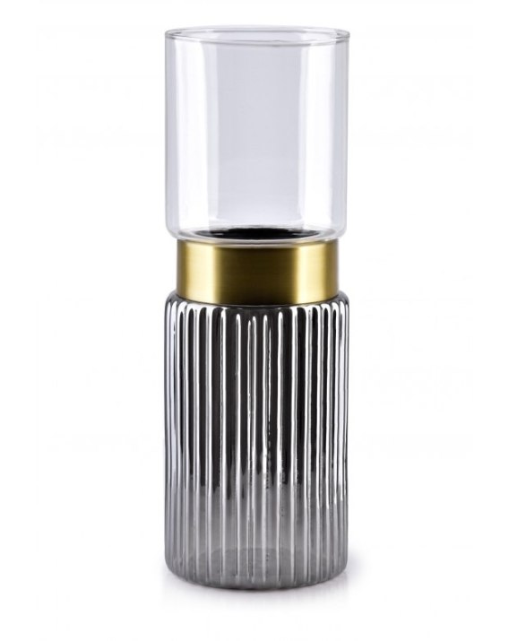 Wazon/świecznik dwuczęściowy to idealne rozwiązanie dla osób, które lubią użytkowe produkty i piękne za razem. Górna część wazonu może służyć jako świecznik, a dolna ryflowana jako wazon lub odwrotnie. Produkt daje nam pełna dowolność zastosowania, może zmieniać się wedle potrzeb. Dzięki złotej obwolucie staje się jeszcze bardziej elegancki.