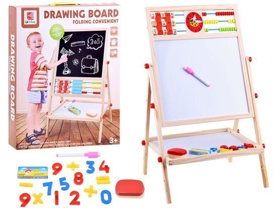 Tablica 2w1 to wersja tablicy magnetyczno kredowej. Tablica posiada dwie płaszczyzny na, której dziecko będzie mogło rysować, malować, pisać. Tablica jest w całości wykonana z drewnianych elementów. Została wzbogacona liczydłem, zegarem, cyframi przeznaczonymi do prostych działań matematycznych oraz, alfabetem.