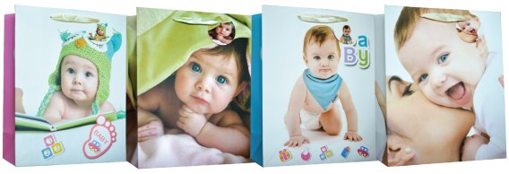 Torba lakierowana z matową laminacją i satynową wstążką jako uchwyt, wzory całoroczne.