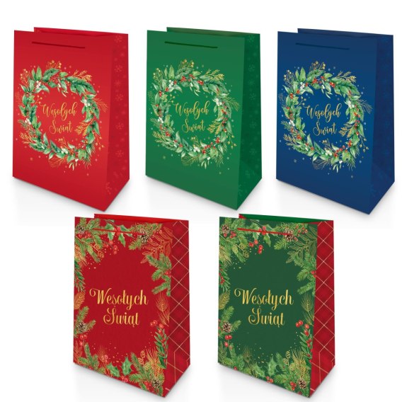 Nasz zestaw dużych toreb prezentowych to eleganckie i praktyczne rozwiązanie na czas Świąt. Klasyczne barwy - zieleń, czerwień i granat - w połączeniu z motywami świerkowych wianków oraz złoceniem nadają im wyjątkowego, świątecznego charakteru. Torby wykonane są z grubego, foliowanego papieru, dzięki czemu świetnie sprawdzają się nawet przy większych prezentach - zachowując estetyczny wygląd i trwałość.