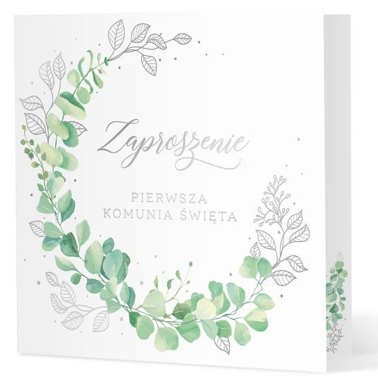 Piękne, gustowne zaproszenie na uroczystość sakramentu Pierwszej Komunii Świętej oraz przyjęcie. Na pierwszej stronie zaproszenia delikatnie błyszczy srebrny napis Zaproszenie i Pierwsza Komunia Święta oraz część srebrnych listków z gałązki otaczającej napisy. Pozostałe, zielone listki na wianuszku pięknie podkreślają srebrny kolor na motywie.