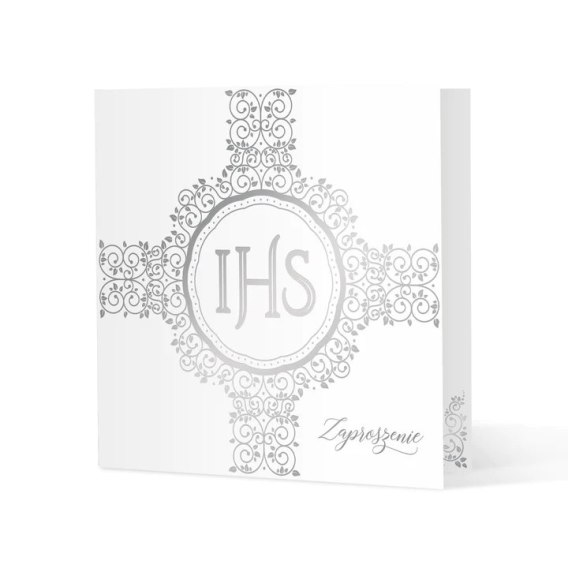 Na pierwszej stronie zaproszenia na komunię i uroczyste przyjęcie znajduje się hostia z napisem IHS wpisana w piękny, koronkowy motyw tworzący kształt krzyża. Przytłumiona biel tła fantastycznie współgra ze srebrnymi napisami i elementami graficznymi.