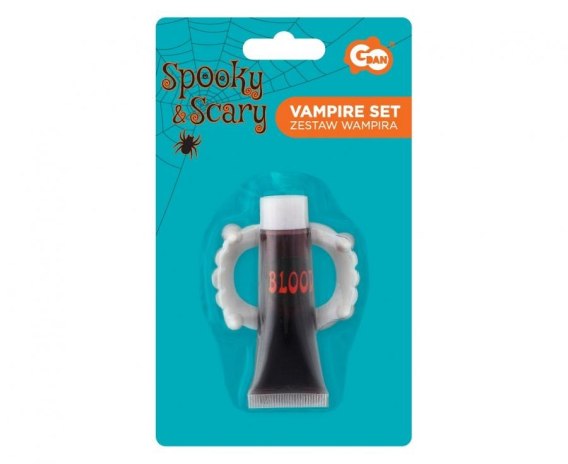 W skład zestawu wchodzą: zęby wampira oraz tubka sztucznej krwi,