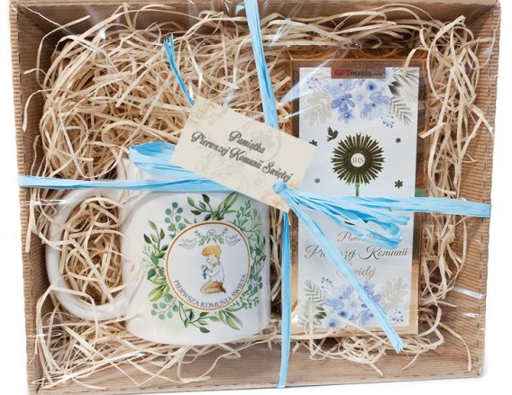 Zestaw "Pamiątka Pierwszej Komunii Świętej" - kubek + czekolada - chłopczyk
