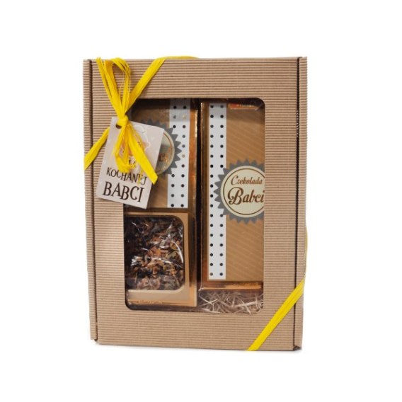 Zestaw prezentowy DLA BABCI Czekolada i Herbata kwiatowa , wzór kropeczki w ozdobnym pudełku z tektury falistej.