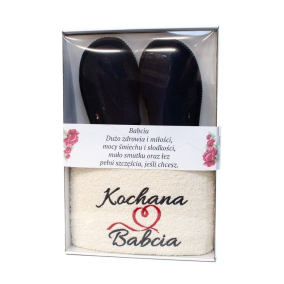 Zestaw prezentowy z ręcznikiem "Kachana Babcia" i kapciami - mix kolorów w ozdobnym opakowaniu